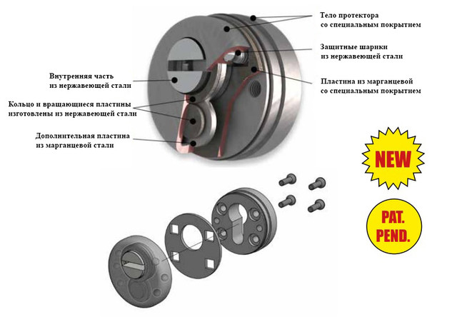 Тіло протектора і пластина з марганцевої сталі забезпечені спеціальним покриттям. Внутрішня частина, кільце, обертові елементи і захисні кульки виконані з нержавіючої сталі. Також протектор забезпечений додатковою пластиною з марганцевої сталі.